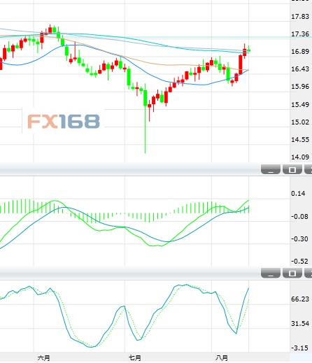 白银周五(8月11日)亚洲时段小幅小幅回落,盘中最低下探17.02美元。上方初步阻力位于17.25美元,下方初步支撑在16.50美元。