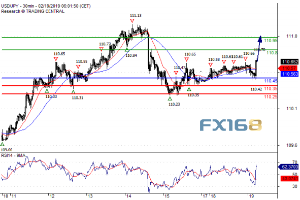 交易策略:在110.45上方看涨,目标位分别看向110.80以及110.95。或者,在110.45下方保持看空,目标位依次看向110.35以及110.25。