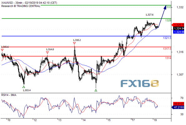 FX168财经报社(香港)讯 周二(2月19日)欧市盘中,现货黄金短线急升,升破前一日高位,刷新10个月高点至1328.81美元,市场接下来将迎来关键的中美新一轮贸易谈判以及美联储最新会议纪要。