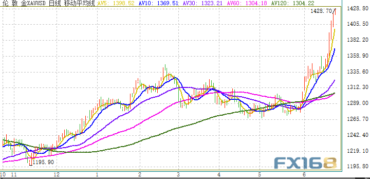 周二亚市早盘,因美联储降息预期打压美元,加之美伊紧张局势升温,现货金价格最高一度触及1428.70美元/盎司,刷新2013年8月以来新高。