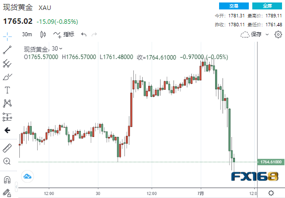 美市盘中,现货黄金持续回落,并刷新日低至1761.48美元/盎司,较日高已跌去近28美元。
