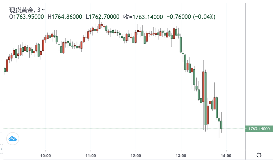 黄金自两大就业报告公布后,震荡加剧,至发稿前扩大跌势,最低触及1761.67水平。
