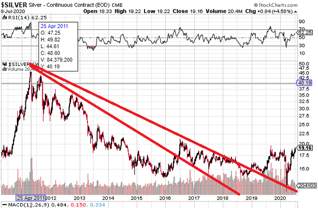 由于全球经济疲软,白银和黄金的价值将继续保持或增加。政府支出增加以及冠状病毒导致的央行刺激措施或多或少会使货币贬值,从而使诸如白银之类的硬资产作为财富储备更具吸引力。而白银的涨势较为滞后,将使其更具有吸引力。