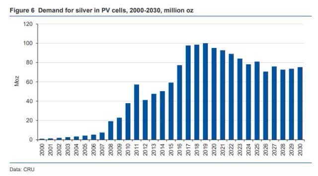 就工业需求方面而言,太阳能电池板行业会大量使用白银。但是,在世界白银协会六月发布的最新市场趋势报告中,他们预测光伏电池对银的需求将从2020年一直下降到2026年。这说明,太阳能电池板可能不会像以前预期的那样大量消耗白银,这也可能是迄今为止白银表现欠佳的原因。