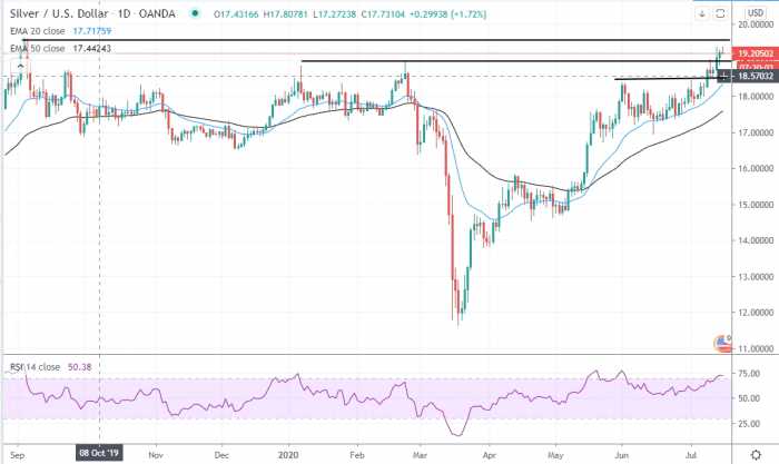 技术面来看,银价继续保持在最近的支撑位19美元/盎司之上,上行趋势明显,但如果跌破这一支撑,可能获得下行动能,跌至18.5美元/盎司。最近的阻力位在19.5美元/盎司。如果银价成功地稳定在这个阻力位之上,它将获得更多的上行动能并朝着下一个阻力位20美元/盎司前进。20美元/盎司是交易员试图克服的一个主要障碍,如果真的突破该点位,市场将迎来一波暴涨。短期内,突破只是时间问题,但可能会出现短暂回调。