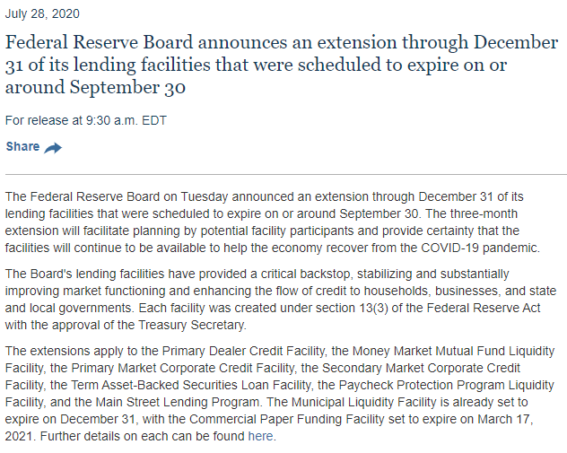 在FOMC决议前一天,美联储突然宣布一则重要决定:宣布将今年3月以来陆续推出的7项紧急贷款机制延长三个月至2020年12月31日,以确保这些工具可以继续帮助经济复苏,此前的截止日期在9月30日左右。