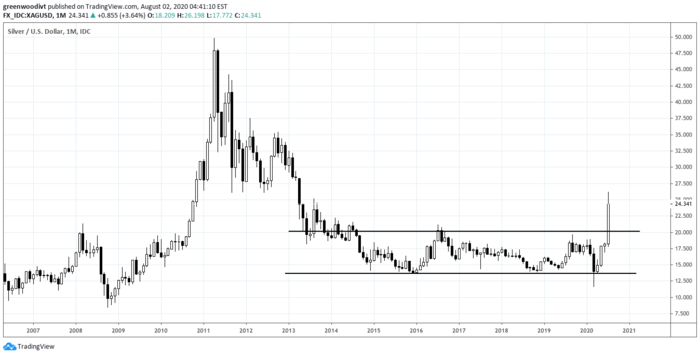 从月线图上看,20美元/盎司的长期阻力已经被打破,白银将很可能开始它的上升趋势,达到40-50美元/盎司的水平。虽然这一上升趋势可能在未来12-18个月持续,但白银短期看来超买。