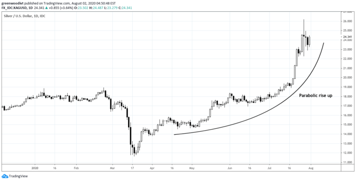 同时,日线图显示,过去几天白银的上涨本质上是抛物线。这种爆炸性举动往往不太可持续。预计白银将经历回调或一段时间的盘整,然后才准备再次走高。这种情况才是健康的长期上升趋势,因为它使市场得以平静下来并消除一些泡沫或投机参与者。