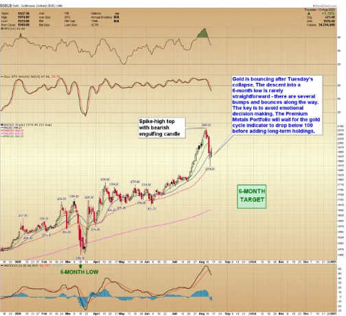 黄金目标:金价在周二暴跌后开始反弹。跌至6个月低点的过程很少是直截了当地——在此过程中会出现几次颠簸和反弹。关键是要避免情绪化的决策。我们将等待黄金周期指标降至100以下,然后再增持长期仓位。