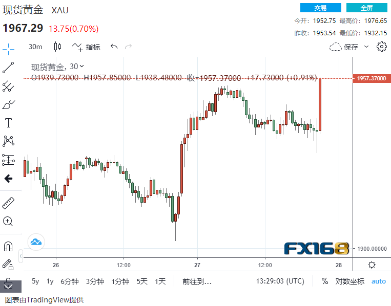 FX168财经报告(香港)讯 周四(8月27日)欧市盘中,现货黄金狂飙,冲破1970关口,最高1976.65美元/盎司;美元指数急跌,下破92.50,最低92.43。
