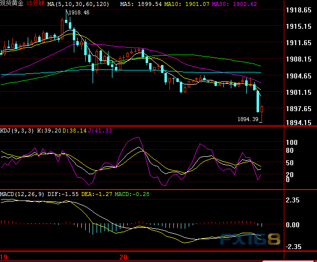 周二亚市盘中,现货黄金短线急跌,金价失守1900美元/盎司关口,最低一度触及1894.39美元/盎司。