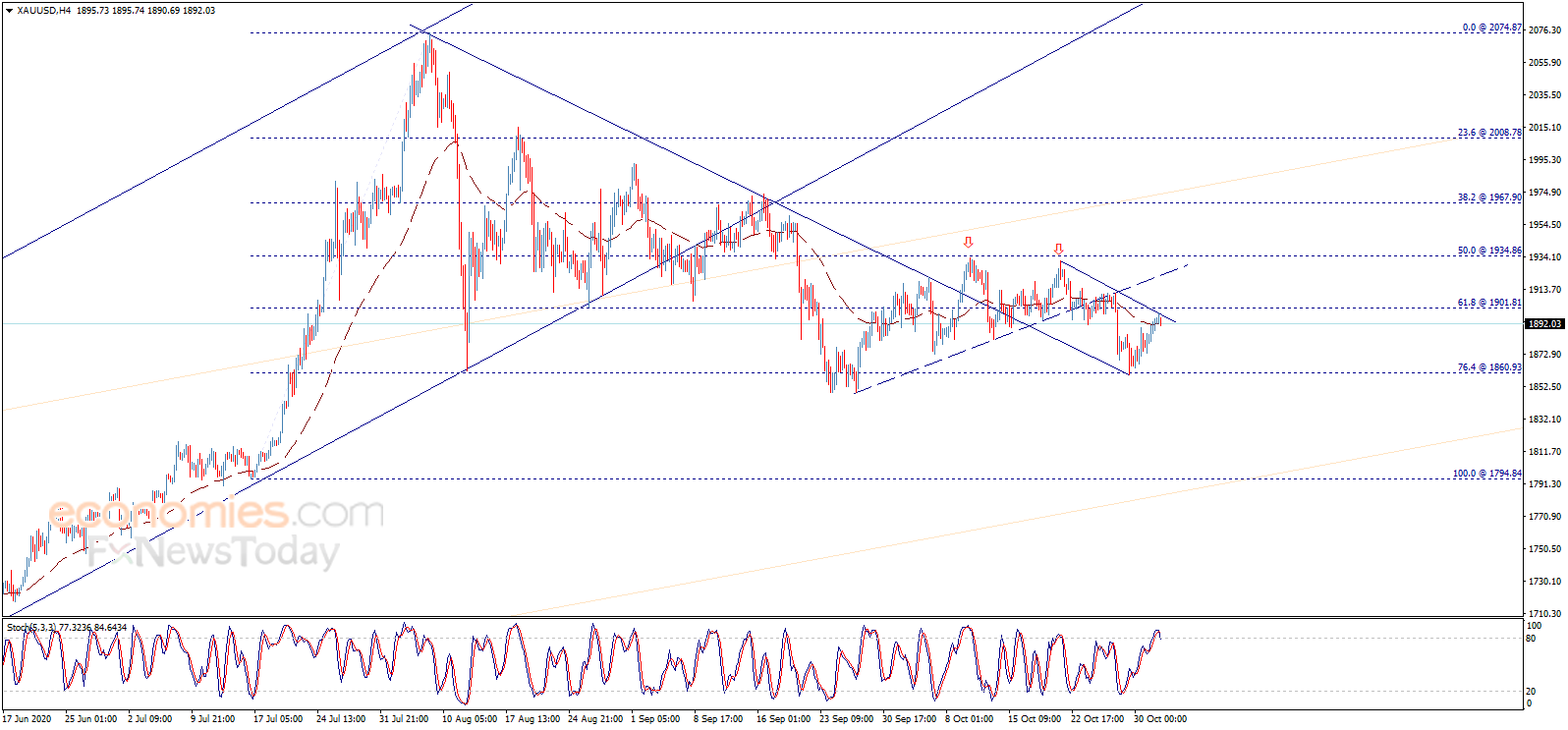 Economies.com在文章中写道,金价昨日继续上涨,并接近关键阻力1901.80美元/盎司。值得注意的是,金价目前开始传递看空信号。如图所示,金价触及了阻力线,且EMA 50指标形成负面压力,随机指标传递明显的负面信号。
