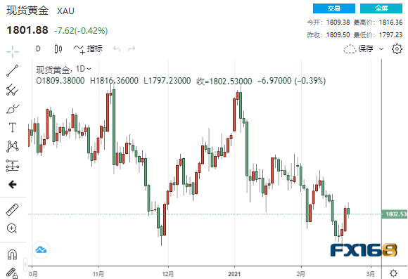 美市盘中,现货黄金失守1800美元/盎司,刷新日低至1797.15美元/盎司,随后自低位回升至1800美元/盎司上方。