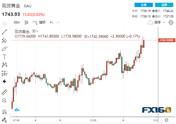 美市盘中,现货金上涨0.9%至1744.22美元/盎司,较日低拉升逾17美元。