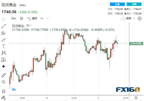 美市盘中,现货黄金持续自日低1730.43美元/盎司反弹,但现仍交投于平盘下方,最新报1740.36美元/盎司。