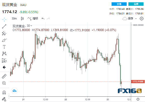 现货黄金自日高1795.96美元/盎司短线大幅下跌26美元,刷新日低至1769.81美元/盎司。