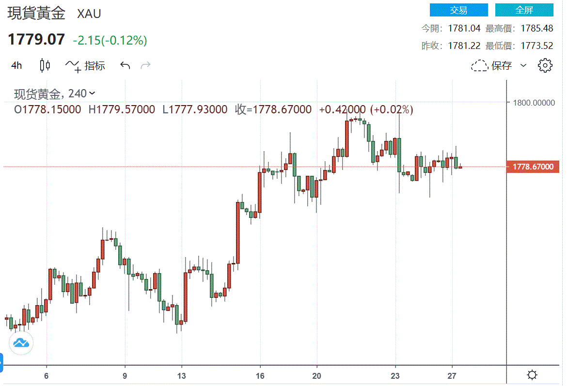 FX168财经报社(北美)讯 周二(4月27日),黄金价格小幅上涨。看涨的短期技术头寸继续限制了对金属的抛售兴趣。美元指数近期走软也是黄金和白银看涨的潜在因素。目前现货黄金小幅下跌0.12%,目前报1779美元/盎司。
