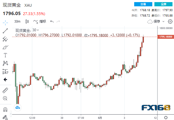 现货黄金涨幅扩大至1.5%,最高触及1797.90美元/盎司,较日低拉升32美元,且自4月23日以来首次站上1790美元/盎司关口。