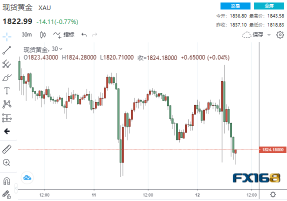 (现货黄金30分钟走势图 来源:FX168)