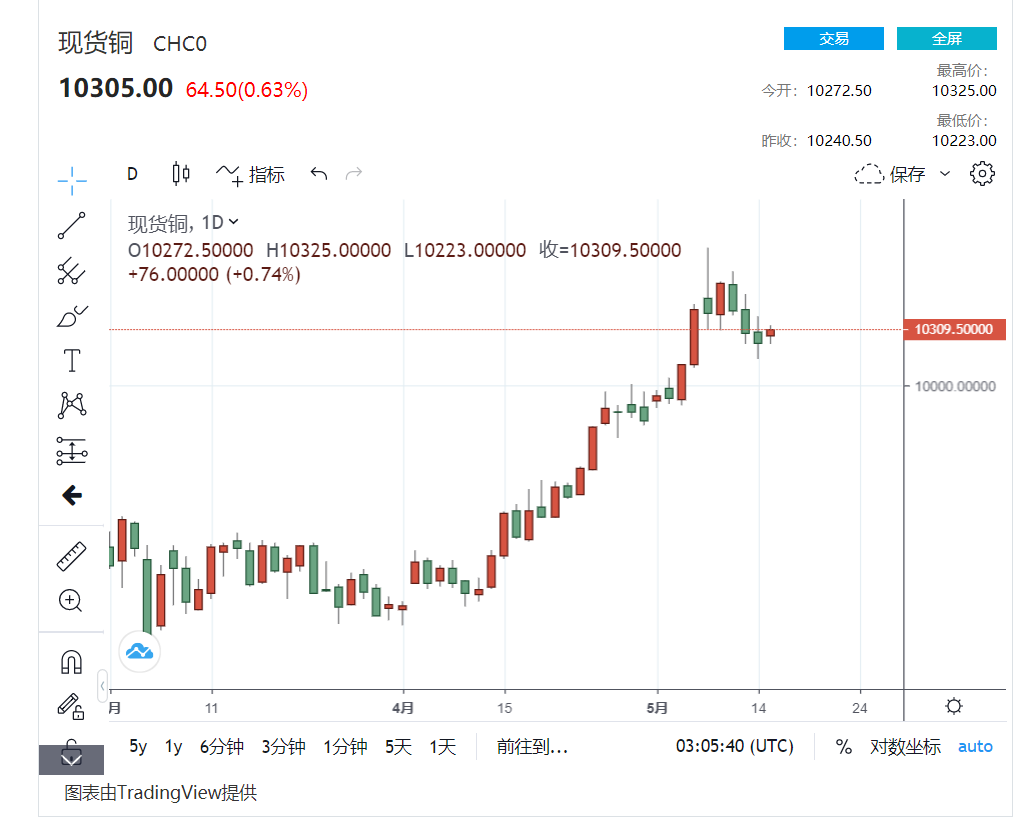 截至截稿前香港时间10时51分,现货铜涨幅达0.63%,至10305美元;黄金则持续走高0.36%,至1850.60美元。