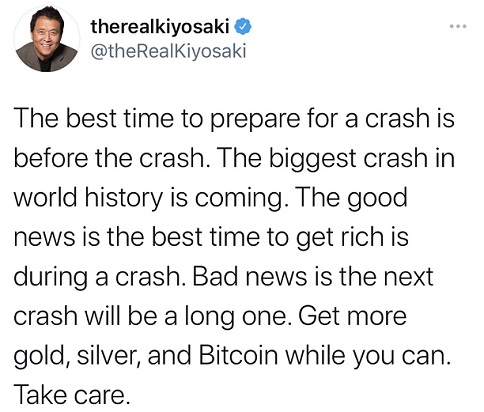 罗伯特·清崎6月28日在其推特发文指出,世界历史上最大的崩盘即将来临,投资者为崩盘做准备的最佳时间就是在崩盘前。好消息是,致富的最佳时机就是在崩盘期间,但坏消息是下一次崩盘可能将会是一场漫长崩盘。罗伯特清崎还建议投资者,在崩盘即将来临前,尽可能买入更多黄金、白银和比特币。他要投资者“小心”。