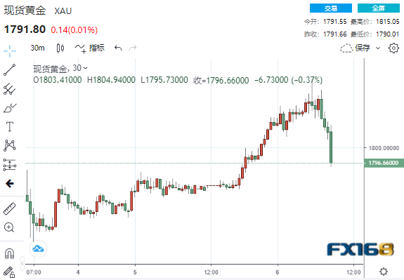 欧美时段盘中,现货黄金一度触及6月17日以来的高点1815.05美元,但随后自高位大幅回落25美元,至1790美元下方。