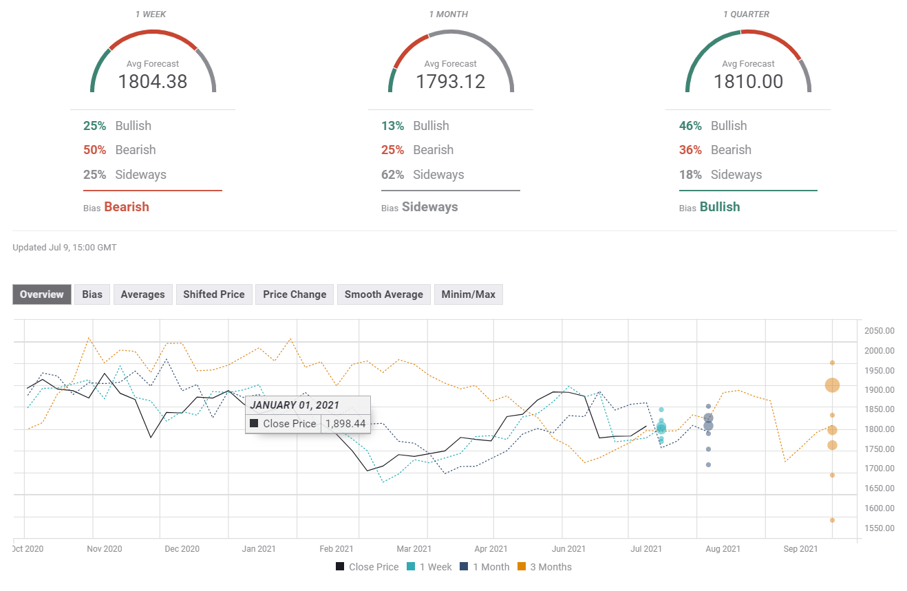 FXStreet黄金调查显示,专家预计黄金在可预见的未来将守住1800美元。前一周,专家预计黄金将在短期和长期内下滑,而本周他们预计金价将在中期内下滑。