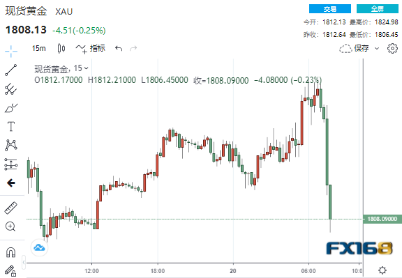 美市盘中,现货黄金短线下跌约16美元刷新日低至1806.45美元/盎司;现货白银日内跌超1%,现报24.88美元/盎司。