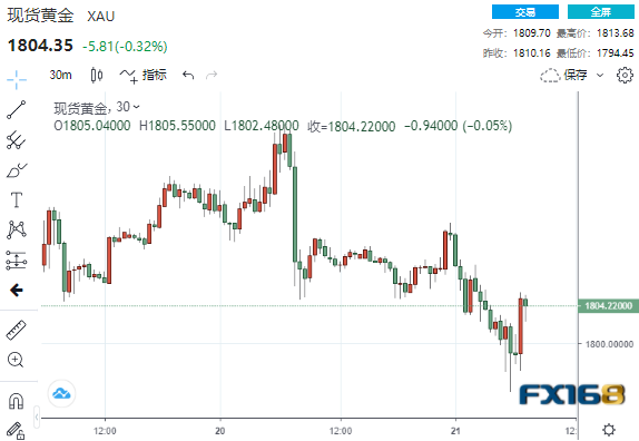 美市早盘,现货黄金一度下跌至1794.45美元低点,较日高回落19美元,现回升至1800美元上方交投。