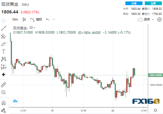 (现货黄金30分钟走势图,来源:FX168)