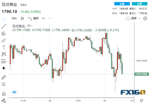 美市盘中,现货黄金下跌逾0.5%,至1796美元一线,日内稍早一度触及1790.42美元低点,较日高回落近20美元。