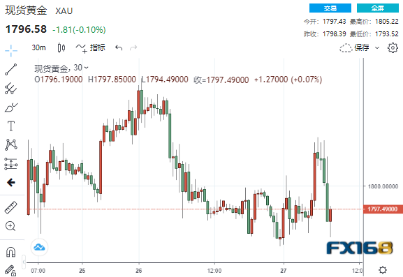 美市盘中,现货黄金迅速跳水并刷新日低至1793.52美元,较稍早触及的日高回落近12美元。