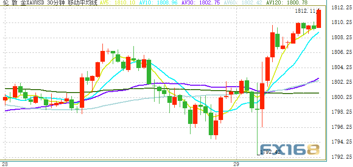 现货黄金自低点1792.42美元/盎司大举反弹,收报1806.95美元/盎司,上涨8.24美元或0.46%。周四亚市早盘,现货黄金短线再度拉升,突破1810美元/盎司,目前最高触及1812.11美元/盎司。