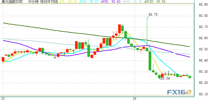 鲍威尔讲话后,美元指数自时段高点大幅下滑,最低触及92.24。美元指数周三收报92.28,下跌0.22%。