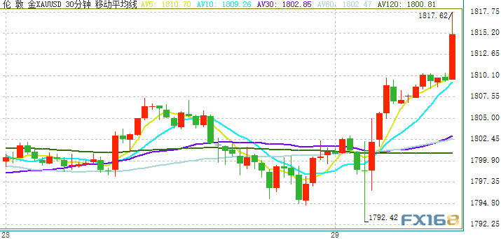 现货黄金自低点1792.42美元/盎司大举反弹,收报1806.95美元/盎司,上涨8.24美元或0.46%。周四亚市早盘,现货黄金短线急涨,金价突破1815美元/盎司,最高触及1817.62美元/盎司。