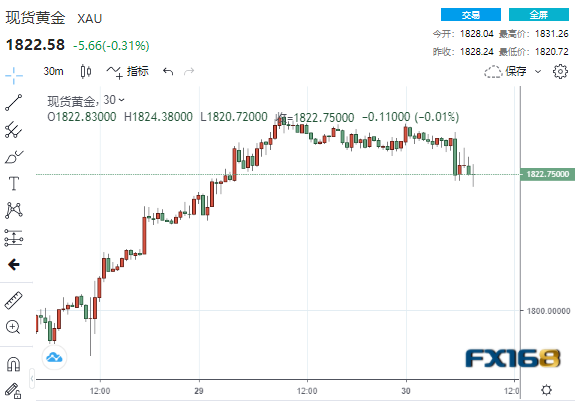 数据公布后,黄金价格短线下跌9美元,并刷新日低至1820.72美元/盎司。