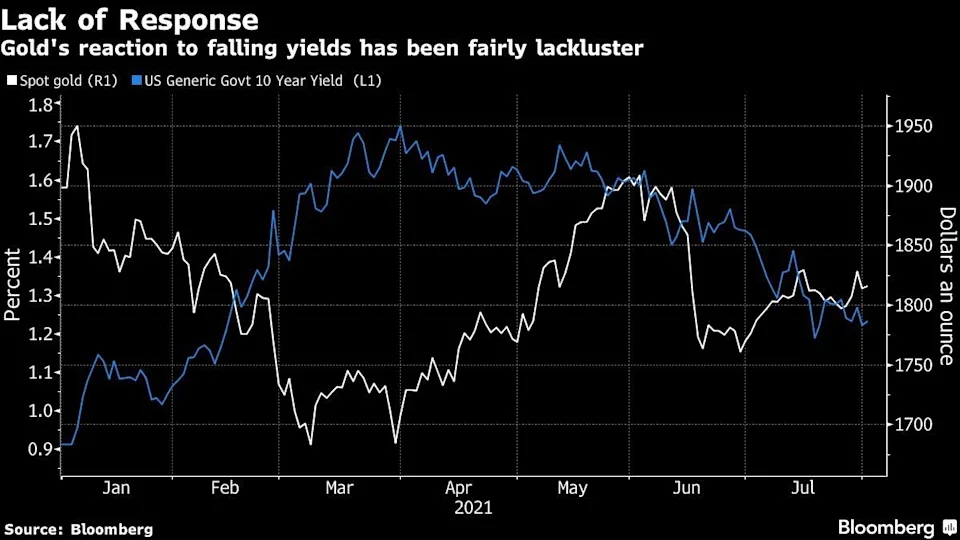 美联储6月份的鹰派态度转变后,金价下跌。当时美联储官员加快了政策收紧的时间表,并表示将开始讨论缩减债券购买规模。自3月底以来,尽管通胀加速,但美国国债价格一直在上涨,10年期实际收益率跌至创纪录低点。这通常会提高持有无息黄金的吸引力,但金价仍远低于去年的高点。
