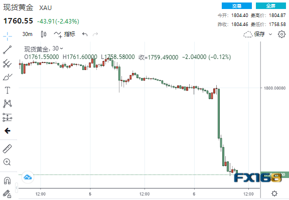 这些乐观的数据发布后,金价暴跌。现货黄金短线大跌逾40美元,自6月30日来首次跌破1760美元/盎司关口,刷新日低至1758.58美元/盎司,日内跌近2.5%;COMEX期银日内跌幅扩大至4%,报24.27美元/盎司。