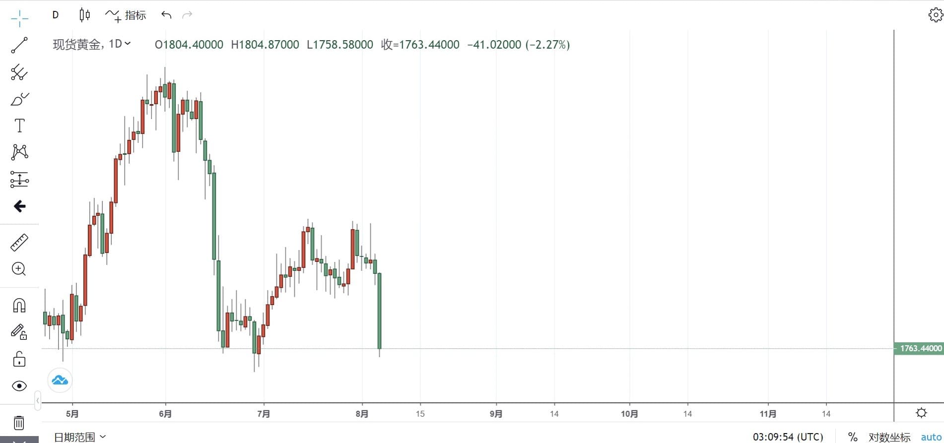 现货黄金本周开于1813.88美元/盎司,最高上测1831.66美元/盎司,最低下探1758.58美元/盎司,最终收于1763.44美元/盎司,大跌50.44美元,跌幅2.78%。