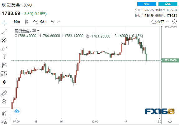 尽管这些数据令人失望,但美元指数仍突破93关口,黄金市场则试图寻找一些动力。欧美时段盘中,现货黄金持续下跌并刷新日低至1780.93美元,较日高回落15美元。