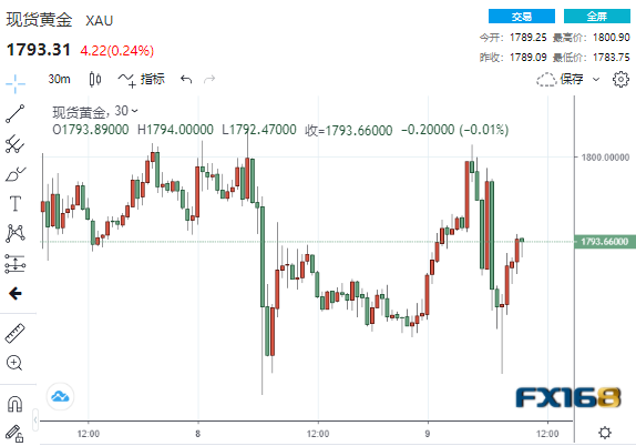 美市盘中,现货黄金价格上涨0.2%,交投于1793美元一线,盘中早些时候曾短暂触及1800.90美元高点,但随后自高位迅速回落17美元,刷新日低至1783.75美元。