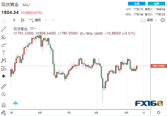 美市尾盘,现货黄金收报1804.34美元/盎司,上涨10.88美元或0.61%,盘中最高触及1808.64美元/盎司,较日低1780.55美元/盎司一度拉升28美元。