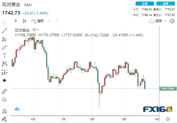 美市尾盘,现货黄金收报1742.73美元/盎司,大幅下跌25.41美元或1.44%,最低触及1737.52美元/盎司,较日高1776.57美元/盎司回落39美元。