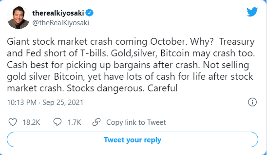 他说:“10月份股市将会大崩盘。为什么?美国财政部和美联储都在发行短期国债。黄金、白银和比特币也可能崩溃,”清崎周日(9月26日)在推特上写道,“现金最适合在崩跌后买便宜货。不卖黄金、白银、比特币,但在股市崩盘后拥有大量现金。股票危险。小心。”