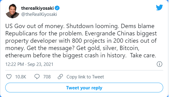 “美国政府没钱了。关闭迫在眉睫。民主党人将这个问题归咎于共和党人。恒大地产是中国最大的房地产开发商,在200个城市拥有800个项目。得到的消息?在历史上最大的崩溃之前获得黄金、白银、比特币、以太坊,”他在另一条推特上说。