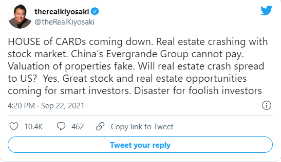 这位畅销书作者将其描述为“倒塌的纸牌屋”,并指出房地产市场将与股票市场一起崩盘。他还认为中国的恒大灾难会波及美国。