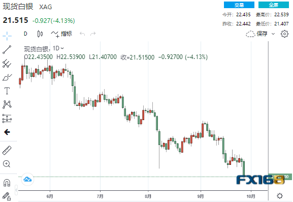 FX168财经报社(北美)讯 周三(9月29日),随着美元上涨,白银一度大跌逾4%,并触及一年多以来的最低点。白银盘中一度重挫4.6%至21.42美元/盎司,为2020年7月以来的最低水平;势创一年来的最大月度跌幅。