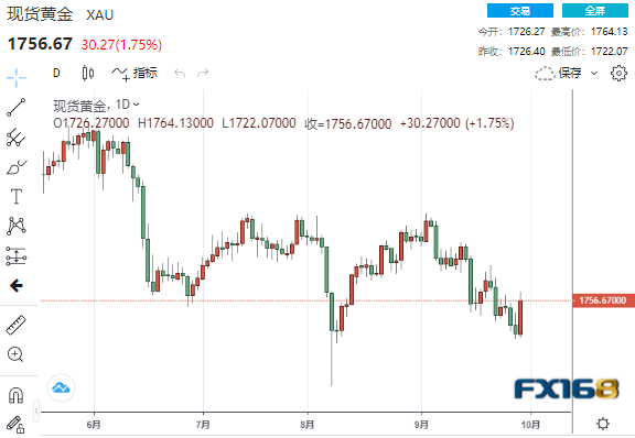 美市尾盘,现货黄金收报1756.67美元/盎司,大幅上涨30.27美元或1.75%,最高触及1764.13美元/盎司,较日低1722.07美元/盎司拉升42美元。
