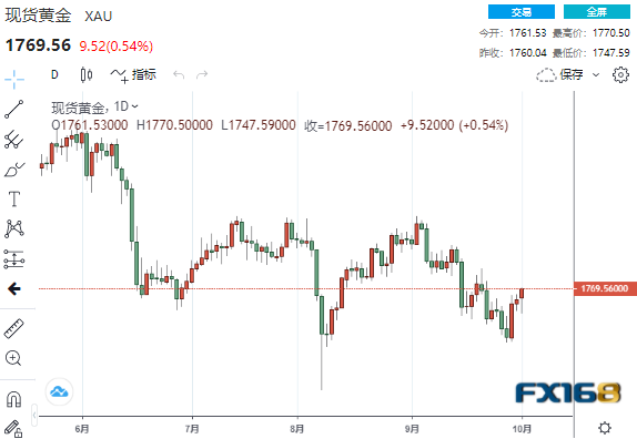 美市尾盘,现货黄金收报1769.56美元/盎司,上涨9.52美元或0.54%,最高触及1770.50美元/盎司,较日低1747.59美元/盎司拉升近23美元。