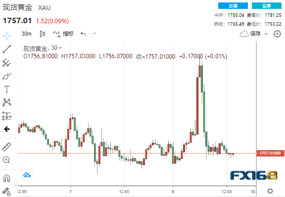 (现货黄金30分钟走势图,来源:FX168)